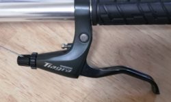 Clarisグレードの、フラットバーハンドル用ブレーキレバーです。フラットバーハンドル用のブレーキレバーには、SoraグレードのBL-R3000、TiagraグレードのBL-4700もあります。値段は、左右ペアでBL-R2000が4,000円程度。グレードが上がると約500円ずつ高くなります。中味は同じだと思います。色の好みとかがなければ、BL-R2000で十分です。写真はBL-4700です。セールで安く買ったか、あるいはBL-R2000が品切れだった時に買ったのだと思います。キャリパーブレーキとVブレーキではワイヤーの引き量が違いますが、レバーの付け根部分のスイッチのようなものを切り替えることで、どちらにも対応します。この機構はどのグレードも共通です。