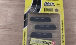 リムブレーキ用のシューならこれです。色は青。アルミリム用です。シマノ用がFLASH PRO、カンパ用がRACE PROと名称が違いますが、素材は同じです。4個で4,000円程度。つまり前後のセットということです。シマノのR55C4が片輪分で1,000円ちょっとなので、値段は約2倍です。でも値段に見合った価値はあります。ぼくはリムブレーキのキャリパーにはカンパニョーロを使っています。カンパのデフォルトのシューでも効きは問題ないし、フィーリングもいいです。SwissStopのシューは、カンパのフィーリングをさらに洗練させた感じです。握った分だけリニアに効きますが、リムへの当たりがしなやかです。しなやかさとリニアな操作性が両立しています。リムへの攻撃性も少なく、雨の日でも制動力が極端に落ちるということがありません。フィーリングでその逆を行くのがシマノのシューです。リムへの当たりが硬質で、カチッとした効き方です。ディスクブレーキのフィーリングに近いです。ドライコンディションでの制動力は十分です。ただ、最近は改善されているかもしれませんが、ドライとウェットで制動力の差が大きいのと、リムへの攻撃性が高いのが気になります。そこへ行くと、SwissStopのシューは、全体をバランス良くまとめていると思います。