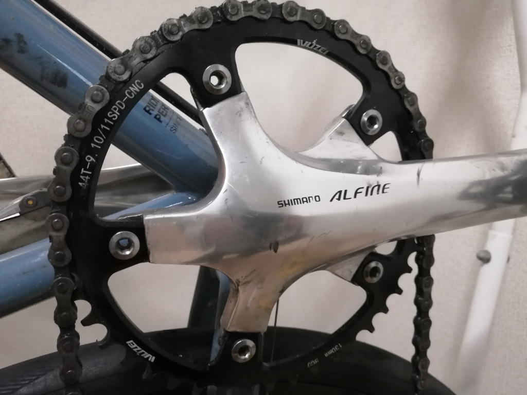 内装変速用のコンポ、ALFINEのクランクです。内装変速用なので、クランクはシングルです。歯数は、39T、42T、45Tから選べます。PCDは130。値段は18,000円程度。中空クランクではありません。でも重量はそこそこ軽いです。ずっと作り続けられるというなら、スクエアテーパーBBのFC-RS200という選択肢もありますが、ホローテックBBの方が、やはり重量のアドバンテージはあります。ALFINEシリーズは、あまり表には出てきませんが、おそらく地味に作り続けられることでしょう。ぼくは今、Marteのクランクとして、このクランクを使っています(マイナーチェンジ前のFC-S500ですが)。実はこのクランク、PCD130の普通のノーマルクランクです。写真2枚目のように、インナーギアを取付けられるようになっています。というか、元々チェーンガードが付いた仕様なので、チェーンガードがアウター側、チェーンリングがインナー側に付いています。ぼくが購入したのは45Tのクランクですが、ロードのフレームでは45Tをインナーに付けると、チェーンステーに干渉します。そこでチェーンガードを外して、チェーンリングをアウター側に付け直したわけです。39Tならインナー側のままで大丈夫です。なので、PCD130のノーマルクランクとして取り扱う方が自然です。