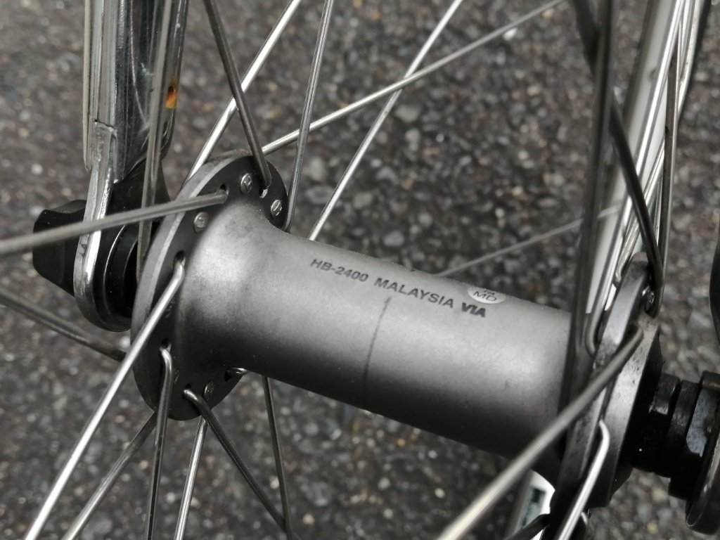 完組ホイールは、ディスクブレーキ用にシフトしています。主要なブランドやグレードは、ほとんどディスクブレーキ用です。リムブレーキ用のホイールが欲しければ、自分で組むしかない状況になりつつあります。以前はClarisグレードで、HB-2400、FH-2400というハブがありました。写真はHB-2400です。たぶんHBがハブの略で、FHがフリーハブの略です。つまりHBが前輪用で、FHが後輪用です。リムブレーキ用のホイールを組むなら、ハブはこれで十分と言えるくらいです。重量は重いのですが、カップ&コーンなので、調整すれば回転性能は上位グレードに引けを取りません。メンテナンスしていけば長く使えます。そしてここが大事なのですが、フランジ幅が広いのです。フランジ幅が広いと、ホイールの横剛性が高くなります。これが駆動力の伝達やコーナリングの安定性に寄与します。でも2400シリーズは廃盤になってしまいました。その後継と言えるのが、SoraグレードのHB-RS300、FH-RS300です。フロントが2,500円くらい、リアが4,000円くらいです。2400と比べるとだいぶ値上がりしました。でも中身は実は同じなのではと思っています。塗装色とロゴを変えただけで、構造は同じじゃないかという気がします。ホール数は28Hと32Hと36H、色はブラックとシルバーがあります。8/9/10速対応です。11速のスプロケットは使えません。11速を使うならば、一つ上のグレード、HB-RS400、FH-RS400が必要です。10速までのスプロケットが使えれば良いということなら、RS300シリーズで十分だと思います。