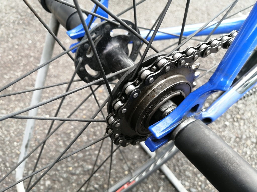 フリーギアというのは、後輪のハブに付いているギアです。ペダルを回した時には駆動力がホイールに伝わり、ペダルを止めた時には、ホイールだけ空走する仕組みです。フリーギアの反対は固定ギアで、固定ギアでは走っているときにペダルを止めることができません。フリーギアの発明によって、自転車は誰もが乗りやすい乗り物になったと言えるでしょう。シマノが創業して最初に作ったパーツがフリーギアです。輸入に頼るしかなかったフリーギアを国産化したわけです。一大パーツメーカーとしてのシマノは、フリーギアから始まったのです。そうした由来があるので、シマノはずっとフリーギアを作り続けるはずです。現在のラインアップで、フリーギアは厚歯と薄歯の2種類があります。SF-1200は厚歯です。値段は4,000円台。以前より値上がりしていますが、シンプルな見かけの割にはけっこう高いです。歯数は、16T、18T、20Tの3種類。ぼくは20Tを今使っています。チェーンは当然厚歯用が必要です。フロントのチェーンリングは、薄歯も使えますが、厚歯で揃えたほうがベターです。