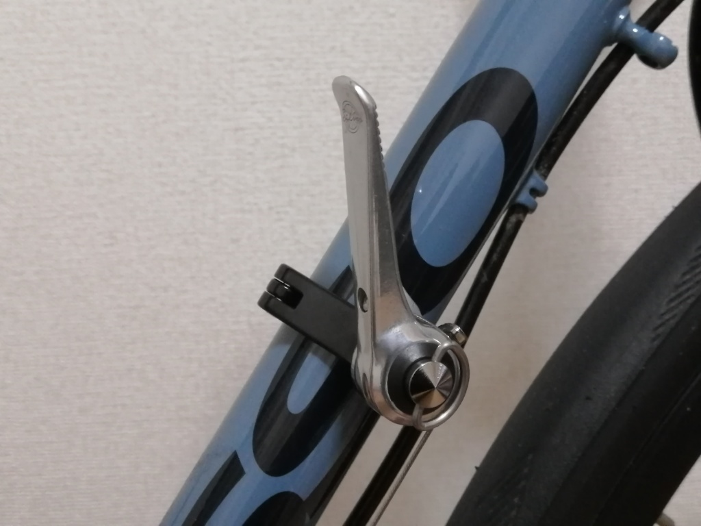 DIA-COMPE(ダイヤコンペ)のWシフトレバーです。Marteに付けています。Wレバーなので本来は左右のレバーがセットなのですが、フロントシングルなので、右レバーだけを使っています。Wレバーにはインデックス式とフリクション式がありますが、DIA-COMPEのはフリクション式です。左右のレバーのセットで、値段は現在6,000円前後です。STI等の手元シフト全盛ですが、Wレバーも根強く残っています。ただし対応するフレームが少なくなっているかもしれません。いわゆるWレバー台座というのが必要です。もし台座がない場合、アダプターで取り付けができる場合もあります。Marteは台座がないので、MR.CONTORLのアダプターを介して取り付けています。フレームのパイプ径によっては、取り付けられない場合もあります。Wレバーの良さは、何よりも機構がシンプルなことです。ほぼメンテナンスフリーです。フリクション式は一見変速操作が難しそうですが、実際はほぼ一発で変速が決まります。つまり次の段にチェーンが移動したところで、自然と操作する手の動きが止まるような感じです。フリクション式は、ディレーラーのバネの力に負けて、レバーが勝手に動いてしまうのではと心配されるかもしれませんが、DIA-COMPEのはその点は大丈夫です。内部にラチェット機構が組み込まれています。それによって、操作の軽さとディレーラーのバネへの抵抗を両立させています。