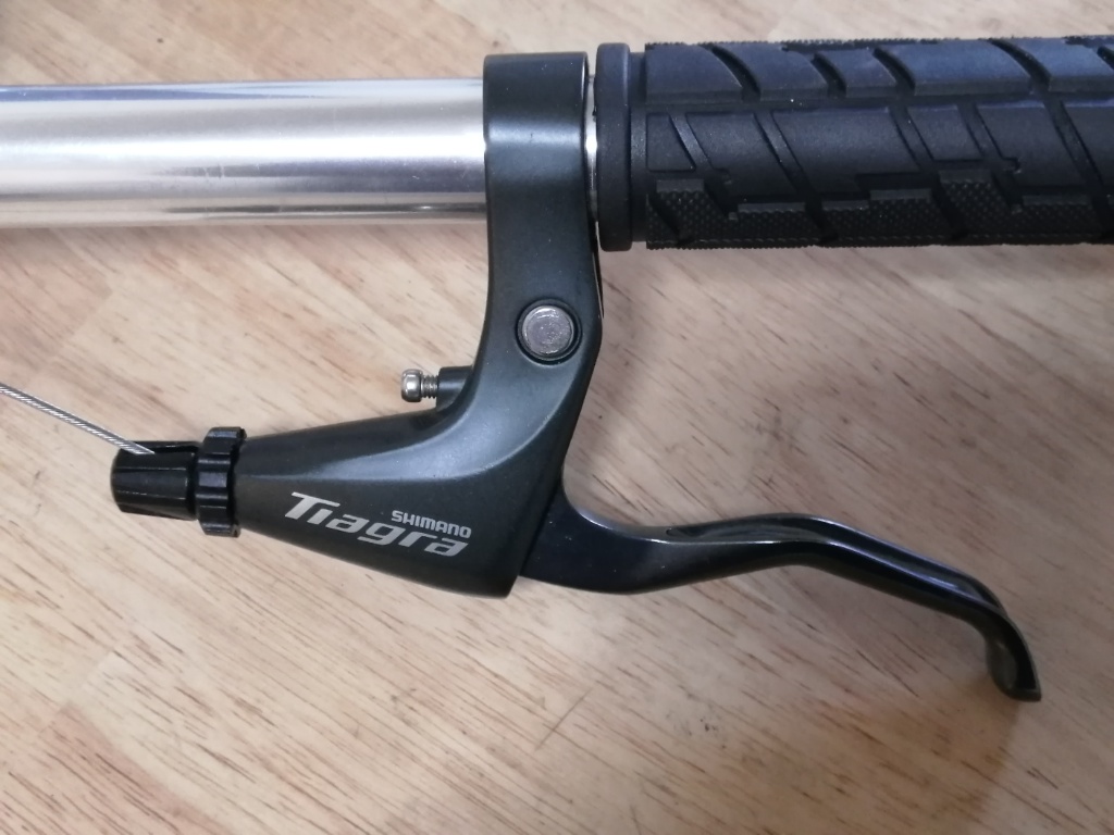 Clarisグレードの、フラットバーハンドル用ブレーキレバーです。フラットバーハンドル用のブレーキレバーには、SoraグレードのBL-R3000、TiagraグレードのBL-4700もあります。値段は、左右ペアでBL-R2000が4,000円程度。グレードが上がると約500円ずつ高くなります。中味は同じだと思います。色の好みとかがなければ、BL-R2000で十分です。写真はBL-4700です。セールで安く買ったか、あるいはBL-R2000が品切れだった時に買ったのだと思います。キャリパーブレーキとVブレーキではワイヤーの引き量が違いますが、レバーの付け根部分のスイッチのようなものを切り替えることで、どちらにも対応します。この機構はどのグレードも共通です。