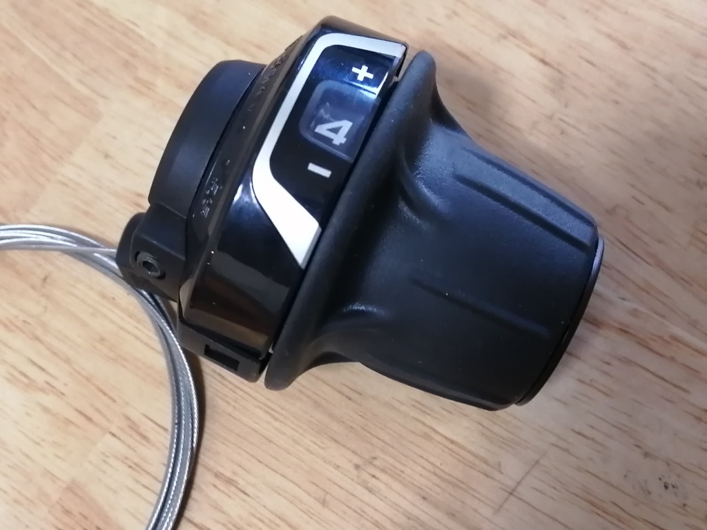 フラットバーハンドル用のシフターで、シマノはレボシフトと呼んでいますが、一般的にはグリップシフトと呼ばれます。8Rは、8速の右シフター(リア変速)の意味です。7速用の7R、6速用の6Rもあります。左シフター(フロント変速)もあります。Lが付くのがフロント3速インデックス式、LNが付くのがフリクション式です。6から8速の変速機を網羅しています。シマノの6-8速の規格は、ロードとMTBで共通なので、幅広く使えるということです。フラットバーハンドルで乗るなら、レボシフトがおすすめです。右シフターの場合は、右まわし(向こうに回す)でシフトアップ、左まわし(手前に回す)でシフトダウンです。これがバイクの進行方向と合っているので、操作は直感的にできます。ちゃんと調整すれば、変速性能は、STIやラピッドファイヤーと変わりません。むしろ一気に何段か飛ばして変速する場合は、レボシフトの方が使いやすいです。ふいに手に力が入った時に、間違って変速してしまうのでは、という意見もあります。ぼくはブレーキレバーよりも内側(ハンドルコラムに近い方)に取り付けていました。変速操作のときに、少しですがハンドルから手を移動させる必要があり、手元変速とは呼べなくなりますが、そんなに気になりません。サムシフターよりも使いやすいと思います。