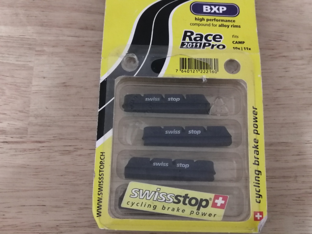 リムブレーキ用のシューならこれです。色は青。アルミリム用です。シマノ用がFLASH PRO、カンパ用がRACE PROと名称が違いますが、素材は同じです。4個で4,000円程度。つまり前後のセットということです。シマノのR55C4が片輪分で1,000円ちょっとなので、値段は約2倍です。でも値段に見合った価値はあります。ぼくはリムブレーキのキャリパーにはカンパニョーロを使っています。カンパのデフォルトのシューでも効きは問題ないし、フィーリングもいいです。SwissStopのシューは、カンパのフィーリングをさらに洗練させた感じです。握った分だけリニアに効きますが、リムへの当たりがしなやかです。しなやかさとリニアな操作性が両立しています。リムへの攻撃性も少なく、雨の日でも制動力が極端に落ちるということがありません。フィーリングでその逆を行くのがシマノのシューです。リムへの当たりが硬質で、カチッとした効き方です。ディスクブレーキのフィーリングに近いです。ドライコンディションでの制動力は十分です。ただ、最近は改善されているかもしれませんが、ドライとウェットで制動力の差が大きいのと、リムへの攻撃性が高いのが気になります。そこへ行くと、SwissStopのシューは、全体をバランス良くまとめていると思います。